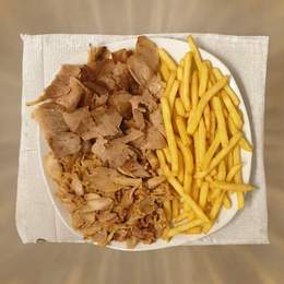 Carne de ternera o pollo o mixto con ensalada turca en los dos platos 2 falafel 2 panes 2 bebidas y patata