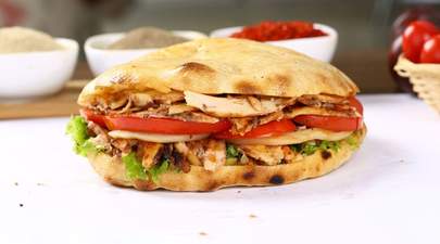 Carne de pollo o ternera en pan pita, lechuga, tomate, cebolla y nuestra salsa de tomate y yogur