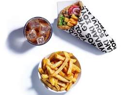 Queso griego de Messinia, a la parrilla, piensa en halloumi pero con una textura más suave, terminado con un poco de orégano y limón. Servido en nuestra caja con pan pita lechuga, tomate, cebolla, perejil, patatas fritas y la salsa que prefieras.