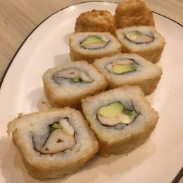 Gamba frita y aguacate por dentro, filetes de salmón y cebolla crujiente por fuera