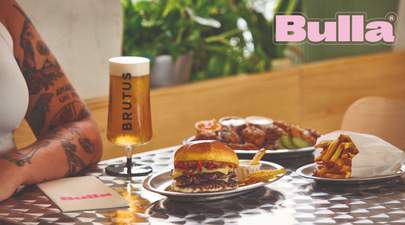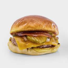 Patty de ternera 100%, cheddar, bacon crujiente, pepinillo y cebolleta, salsa club, pan brioche tostado con mantequilla.