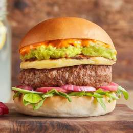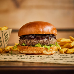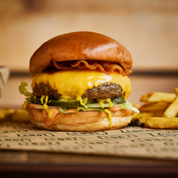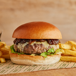 Hamburguesa de vaca a la brasa (150 g) con queso cheddar fundido, mayonesa picante, relish de chili, jalapeños y lechuga fresca en pan de brioche. Servida con papas fritas caseras con sal y romero o ensalada verde aliñada