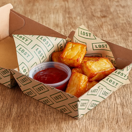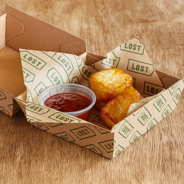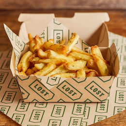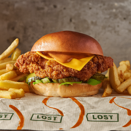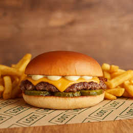 Hamburguesa de lomo alto a la brasa (150 g) con cebolla caramelizada, nuestra salsa secreta Lost, queso americano fundido y lechuga fresca. Servida con papas fritas caseras con sal y romero o ensalada verde aliñada