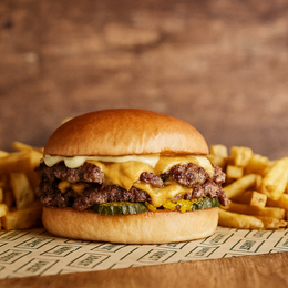 Doble carne smash (150 g.), doble queso americano, cebolla caramelizada, pepinillos y mayonesa de mostaza y mantequilla marrón. Servida con papas fritas caseras con sal y romero o ensalada verde.