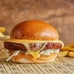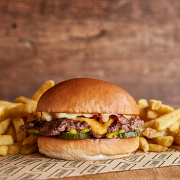 2 smashed beef patties, smoked bacon, American cheese, sweet onions, pickles & brown butter mayo