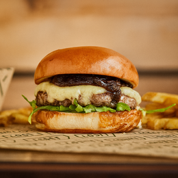 Hamburguesa de lomo alto a la brasa, queso azul cremoso, cebolla caramelizada en relish y lechuga fresca. Servida con papas fritas caseras con romero, ensalada de col o ensalada verde aliñada.