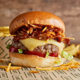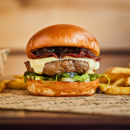 Hamburguesa de lomo alto a la brasa, queso cheddar, cebolla caramelizada en relish y lechuga fresca. Servida con papas fritas caseras con romero, ensalada de col o ensalada verde aliñada