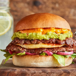 Hamburguesa de lomo alto del mercado local, halloumi, mayonesa de harissa rosa, aguacate smash, cebolla encurtida rosa y rúcula.