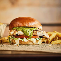 Hamburguesa de pollo a la brasa con albahaca fresca, pesto, mayonesa de mostaza y mantequilla tostada, tomate y rúcula. Servida con papas fritas caseras con sal y romero o ensalada verde aliñada