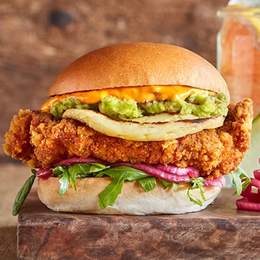 Pollo frito estilo Lost, halloumi británico, mayonesa de harissa rosa, aguacate triturado, cebolla encurtida rosa y rúcula.