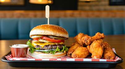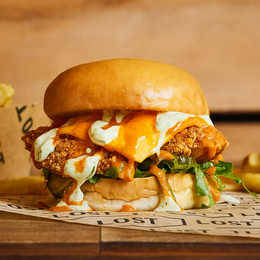 Hamburguesa de pollo frito con queso americano, salsa búfalo, mayonesa ranch, lechuga fresca y pepinillos. Servida con papas fritas caseras con sal y romero o ensalada verde aliñada