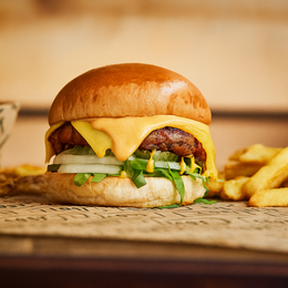 Hamburguesa Beyond Meat con queso cheddar vegano Violife, mayonesa de chipotle, mostaza, cebolla, pepinillos y lechuga fresca. Servida con papas fritas caseras con sal y romero o ensalada verde aliñada