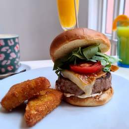 Nuestra jugosa hamburguesa casera en bollo de brioche acompañado de rúcula, tomate, queso manchego y mayonesa.