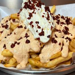Patatas fritas, Salsa carnal, nata agria, bacon bits