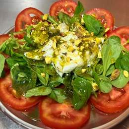 Canónigos, Burrata, Tomate, Pesto pistacho, Miel y Crujiente de pistacho