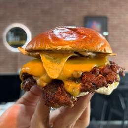 Pollo crujiente, doble queso cheddar, salsa barbacoa Jack Daniels, cebolla caramelizada, lechuga Batavia y salsa 4 quesos