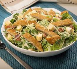 Mezclum de lechuga, pollo crujiente, bits de pan cruch, queso parmesano y salsa César casera