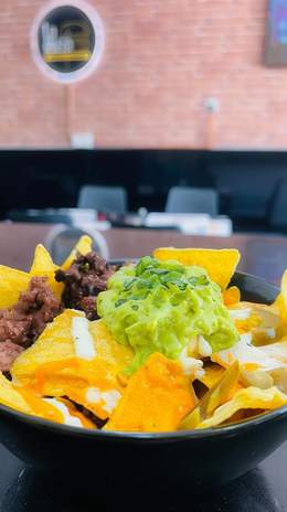 Nachos con guacamole, crema agria, carne picada, jalapeños en rodajas, pico de gallo y queso cheddar fundido