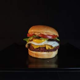 Carne de vaca 100 % española, doble queso cheddar fundido, huevo frito, bacon crunch, tomate, lechuga Batavia y salsa relish