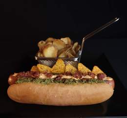 Pan brioche, salchicha braseada, guacamole, bacon bits, cheddar fundido y chips de nachos