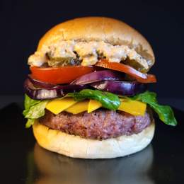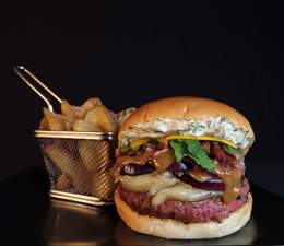 Pan brioche, carne de vaca 100 % española, doble queso cheddar fundido, lechuga Batavia, cebolla morada al grill, pepinillos troceados, tomates y salsa relish