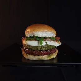 Carne de vaca 100 % española, burrata fresca, jamón ibérico crujiente, salsa de pesto, rúcula y mayonesa trufada