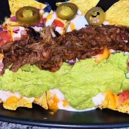 Nachos, Guacamole, Crema agria, Pulled pork de la casa, jalapeños en rodajas, pico de galloy cheddar fundido