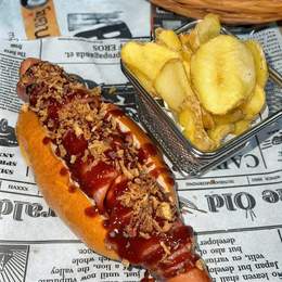 Pan brioche, salchicha rellena con queso cheddar, envuelta en bacon, con salsa BBQ y lluvia de cebolla crunchy