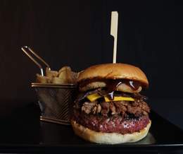 Carne de vaca 100 % española, pulled pork jugoso, deliciosa salsa barbacoa Jack Daniel's, doble queso cheddar fundido, bacon ahumado y aros de cebollas crunch (sin patatas)
