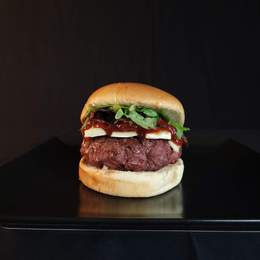 Carne de vaca 100 % española, bacon crunch, mermelada de tomate, queso brie fundido y rúcula