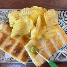 Dos sandwich de miga, puedes elegirlos tostados, servidos con sus patatas (copetin) y oliva.+ Cafe solo, Cortado o con Leche
