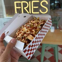 French Fries con salsa cheddar casera y virutas de bacon tostado. Apto para intolerantes al gluten.