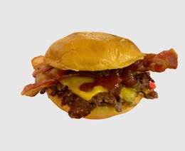 Doble hamburguesa de ternera (2x70gr.), cebolla incrustada(estilo oklahoma)(toque mostaza) doble cheddar, bacon y salsa redline .