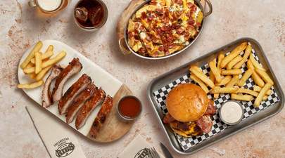 100% angus, queso emmental, mayonesa ahumada, bacon horneado con salsa BBQ honey y cebolla crujiente. Acompañado de patatas fritas.