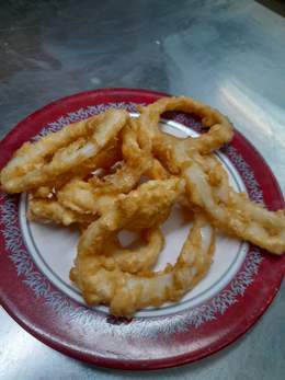 Tacos de merluza bien fritita con boquerones y calamares, todo de elaboración propia