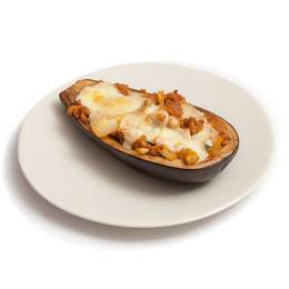 Berenjena rellena de carne boloñesa, bechamel y cubierta de queso. Elaborada al momento y gratinadas en horno