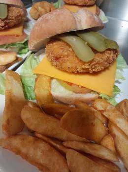 Jugosa pechuga de pollo empanada con crujiente panko, acompañada de patatas caseras