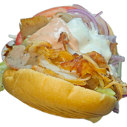 Ternera, mixto o pollo, pan normal, lechuga, tomate, repollo, cebolla, salsa yogurt y rosa