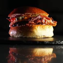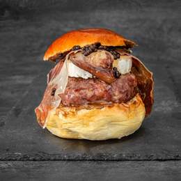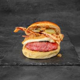 Pan brioche, potato roll con queso mozarrella, cebolla caramelizada, bacon crujiente y pepinillo.