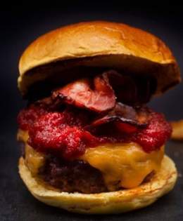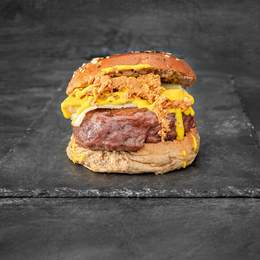 Carne de black Angus certificada USDA PRIME, con mermelada de bacon, cebolla, mistela, cheedar ahumado, salsa EMMY y kikos.