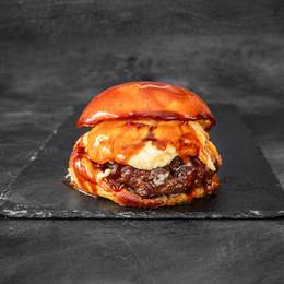 Carne de 200 gr de Black Angus con pan brioche edición black, queso brie, mermelada de naranja amarga caramelizada y salsa americana.