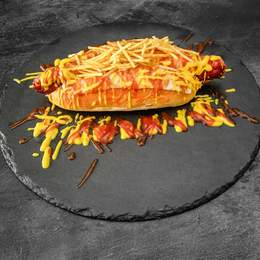 Pan brioche, longaniza de pollo linea gourmet, queso mozzarella, patatas paja, mostaza, ketchup, especies.