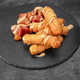 Patatas pop extracrujientes con salsa de cheedar y cecina de vaca