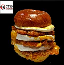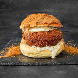 Hamburguesa de pollo rebozada, rellena de queso mozarrella, pan juanito baker potato roll, salsa de mayonesa, ajo, cebolla caramelizada, topping de crema lotus y migas de galleta lotus.