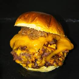 Con carne de pollo 100gr cada disco, queso cheddar al fallo y pulled pork.