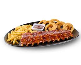 Costillas de cerdo a la BBQ, con aros de cebolla, patatas fritas y salsa BBQ Chipotle.