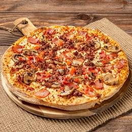 Salsa de tomate, mozzarella, ternera, bacon, champiñón, pimiento rojo y extra de mozzarella
