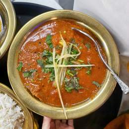 Trozos de cordero cocinado en salsa a base de cebolla morada, jengibre, ajo, tomate y especias de sabor inteso