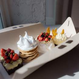 Incluye porción de pastel a elección, brownie de chocolate y frambuesas, alfajor de almendras relleno de dulce de leche, alfajor de maicena, cookie, medialuna y dos sandwiches de miga.