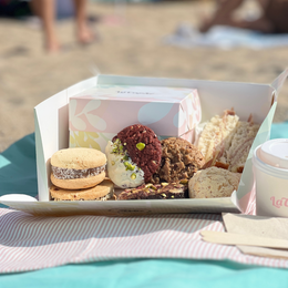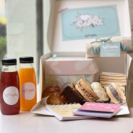 Incluye una porción de pastel a elección, dos cookies, un alfajor de maicena, una pastafrola, un sándwich de pan brioche y dos chipa.